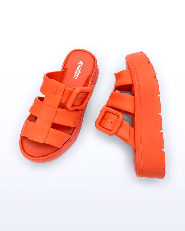 The Melissa Pump Platform is a women’s slide sandal that combines practicality, style, and comfort in one versatile shoe. Made from durable PVC, it features two wide upper straps for added stability and a bold side buckle that allows for a personalized fit while standing out as a key design detail.
