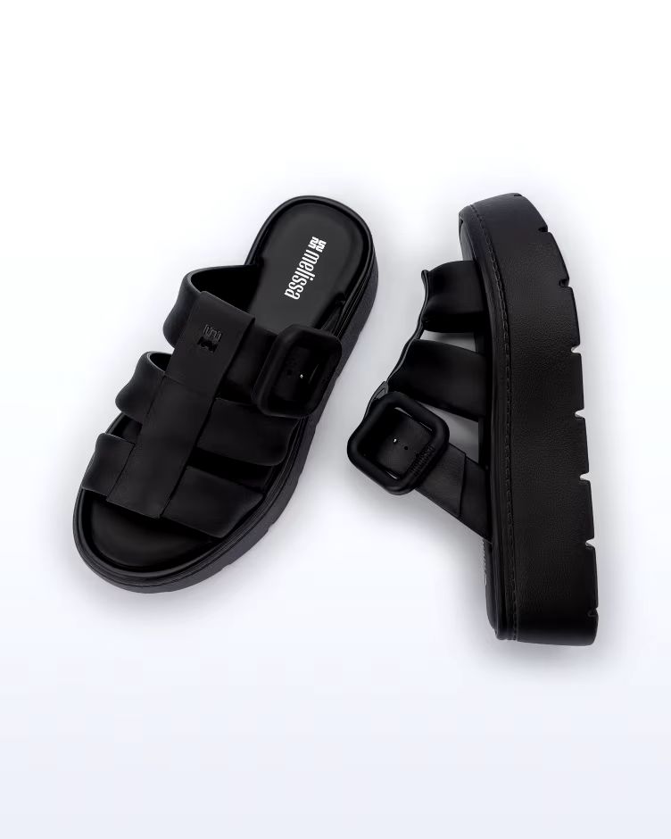 The Melissa Pump Platform is a women’s slide sandal that combines practicality, style, and comfort in one versatile shoe. Made from durable PVC, it features two wide upper straps for added stability and a bold side buckle that allows for a personalized fit while standing out as a key design detail.