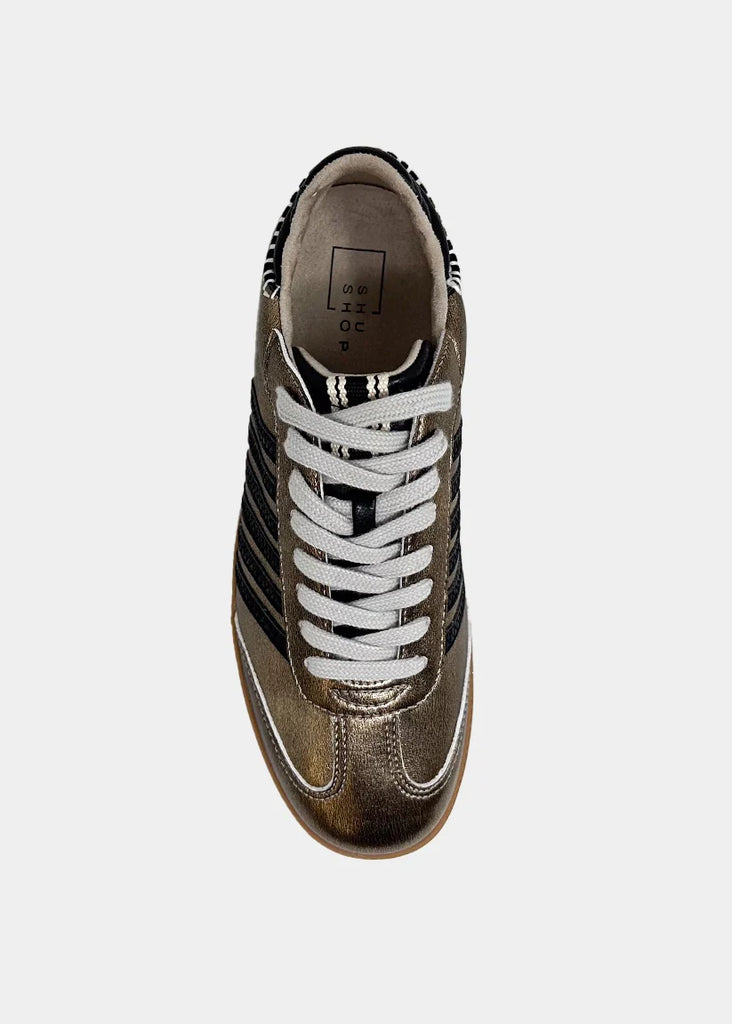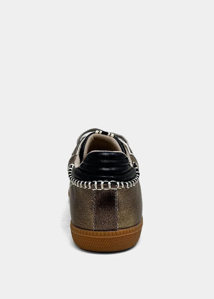 Add instant shine to your step with STELLA GOLD. This glam-meets-retro sneaker stands out with its golden metallic finish, quilted black heel, contrast suede stripes, and a signature whipstitch detail at the back. Designed to elevate your everyday look, yes, even sweats. This is the bold sneaker moment you didn’t know you needed.