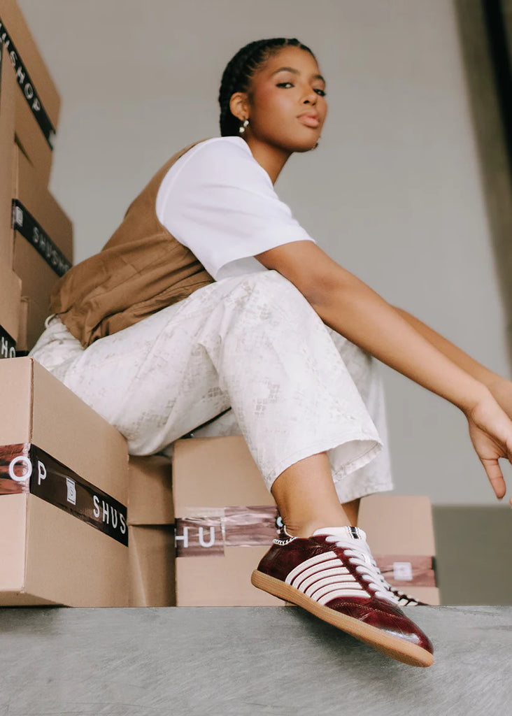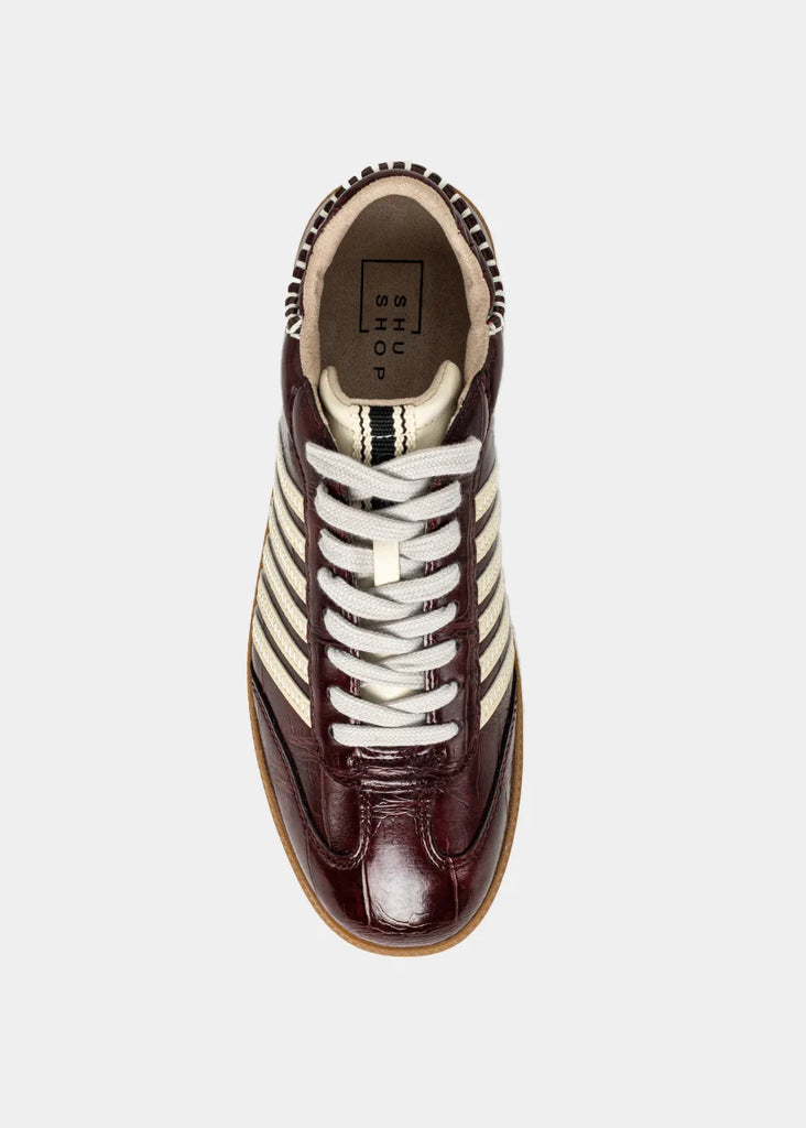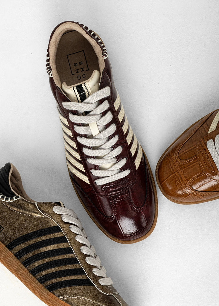 Vintage-inspired and unapologetically bold-meet STELLA in Dark Red. This retro sneaker features croc-embossed faux leather in a rich wine hue, contrasted with creamy woven stripes and a gum sole for that sport-meets-luxury energy. The metal chain detail at the heel adds a final touch of cool.