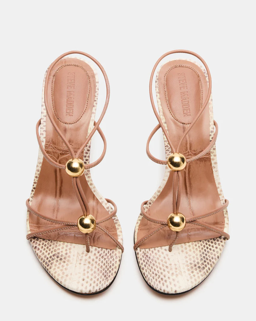 Introducing the RAMOS, the perfect combination of elegance and edge. Featuring a strappy stiletto heel adorned with gold hardware accents, these shoes will elevate any look. Step out in style and confidence with these stunning heels.