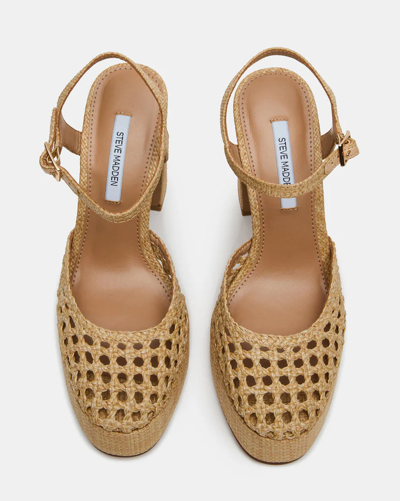 This LEXIE RAFFIA NATURAL platform heel combines architectural design with everyday versatility. The intricately woven upper creates visual depth and texture, while the secure ankle strap delivers a custom fit. A substantial block heel and platform sole offer confident stride and lasting comfort throughout the day. The structured silhouette transitions seamlessly from casual to polished occasions, making it an indispensable addition to any footwear collection.