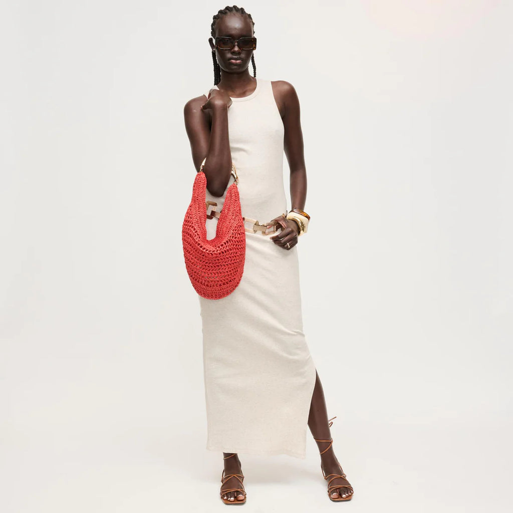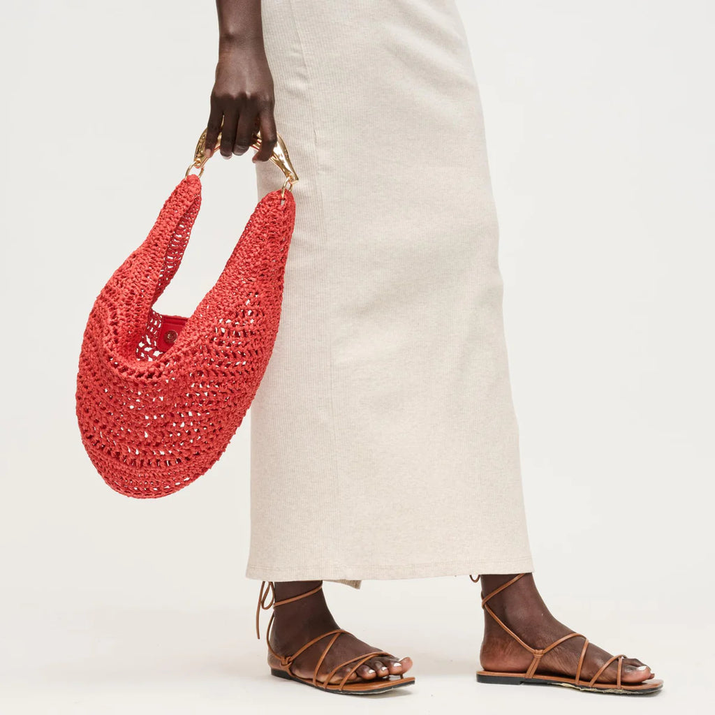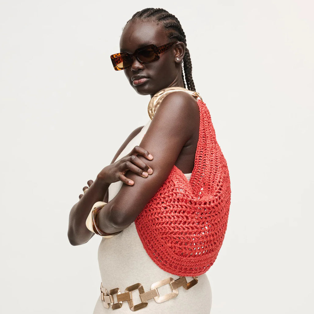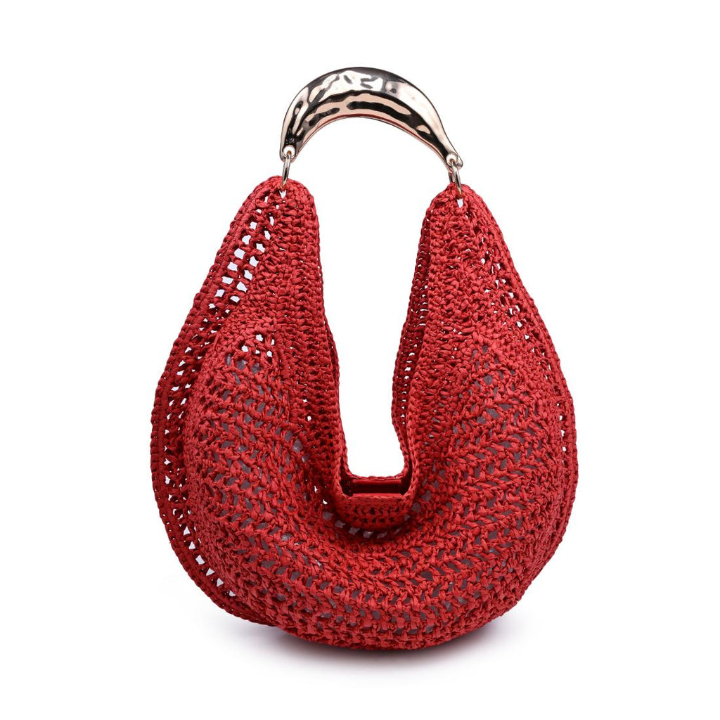 Camden Hobo — slouchy woven silhouette topped with a sculptural hammered top handle. Open-weave body, roomy lined interior, lightweight slouch for effortless shoulder or hand carry. Statement metal arch handle, subtle hardware, versatile day-to-night styling. Ethically minded design sensibility, modern boho appeal, great for workdays, weekend markets, summer evenings. Practical, fashion-forward and easy to pair with current trends — a standout hobo that feels polished yet relaxed. Buy now to secure a seasonally relevant staple.